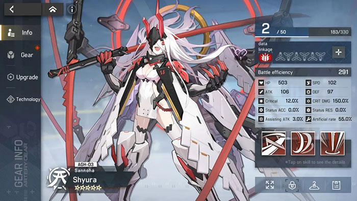 Shyura là nhân vật với kỹ năng tấn công có thể gây ra lượng sát thương cao nhờ sự trợ giúp của Ultimate Skill, debuff ATK của kẻ thù, đồng thời tăng cường tác dụng của kỹ năng bằng cách tự cấp cho mình Shyura Mode.
