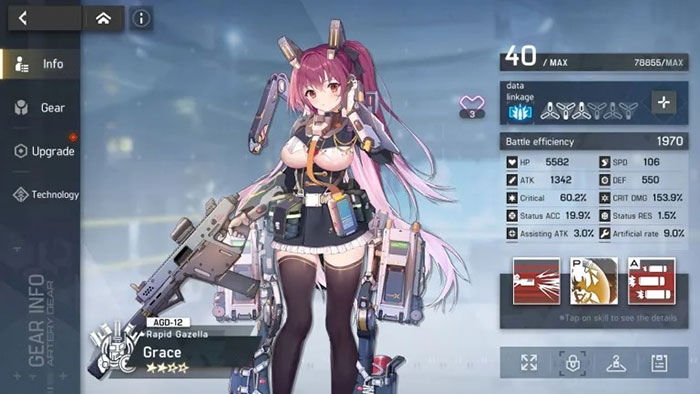 Grace là một AG Thunder Assault mạnh mẽ với một bộ kỹ năng hữu ích. Mặc dù phụ thuộc rất nhiều vào việc hạ gục các đòn chí mạng để có thêm lượt và giảm thời gian hồi chiêu của kỹ năng, nhưng cách Grace dùng Ultimate Skill gây nhiều sát thương hơn dựa trên lượng HP bị mất bởi mục tiêu đối phương. Như một phần thưởng bổ sung, Ultimate Skill t sẽ đặt lại thời gian hồi chiêu nếu Grace giết được kẻ thù bằng nó.
