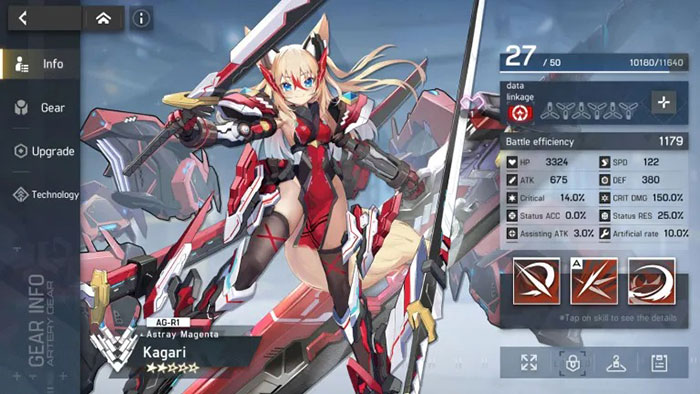 Kagari là một AG Molten Tactical có thể trì hoãn lượt tấn công của đối phương. Kỹ năng thứ nhất và thứ hai có thể tăng thời gian kẻ địch đợi đến lượt của chúng, và Ultimate Skill của Kagari xua tan hiệu ứng buff và làm chậm tất cả kẻ địch trong khi gây sát thương đáng kể.