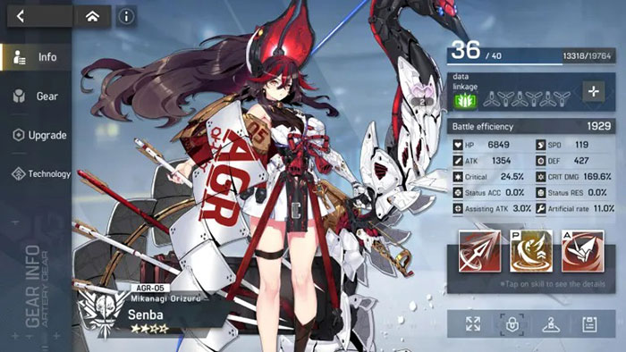 Senba sở hữu một kỹ năng hữu ích cho phép hồi sinh nếu HP giảm xuống 0, mặc dù điều này yêu cầu phải sử dụng Ultimate Skill trước và tiêu tốn 20% HP hiện tại. AG này cũng có thể tăng tốc độ của bản thân và gây ra nhiều sát thương hơn nếu có ít HP hơn. Cuối cùng, đòn tấn công cơ bản của Senba có thể phục hồi HP của chính mình, khiến cô ấy trở thành một đơn vị tự cung tự cấp.