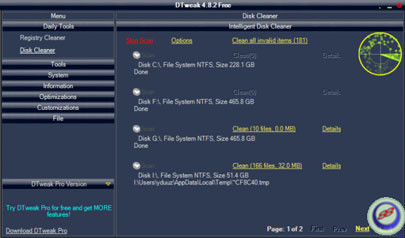 DTweak bao gồm Registry Cleaner, Disk Cleaner, Disk Defragmenter, Hard Drives Monitor và nhiều công cụ khác, cộng thêm khả năng tối ưu hóa và tùy chỉnh cho Firewall, Internet Explorer, Windows Media, Windows Mail các ứng dụng khác có trong gói Windows Package.