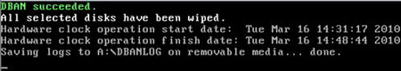 Giao diện tiếp theo hiện ra, bạn hãy chỉ đến ổ đĩa muốn tiến hành xóa dữ liệu và nhấn phím F10 để tiến hành ra lệnh xóa dữ liệu của ổ đĩa cứng đó. Khi đó, bạn cứ để cho chương trình thực hiện việc xóa dữ liệu cho bạn cho đến khi nhận được thông báo DBAN succeeded nghĩa là quá trình xóa sạch dữ liệu đã được hoàn tất là xong.
