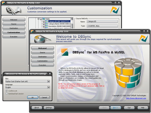 DBSync for MS FoxPro and MySQL 4.5 là một phần mềm doanh nghiệp có thể thực hiện chuyển đổi cơ sở dữ liệu MS FoxPro thành MySQL, MySQL thành FoxPro. Nó có thể đồng bộ, có khả năng chuyển đổi các bảng cụ thể nào đó bằng cách cấu hình một số tùy chọn trong ứng dụng wizard. Nó có khả năng tổ chức công việc bằng cách sử dụng các tham số dòng lệnh được cấp bởi bộ lập lịch biểu, bộ lập lịch biểu này dùng để chạy chương trình và được lập một lần từ trước.