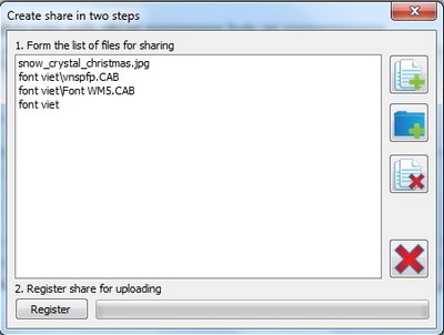 Sau khi đã chọn xong dữ liệu cần chia sẻ, nhấn nút Register trên hộp thoại này để đăng ký với máy chủ của phần mềm. Sau khi hoàn tất quá trình đăng ký (diễn ra rất nhanh chóng), một hộp thoại khác hiện ra, trong đó có chứa đoạn mã được sử dụng cho quá trình chia sẻ và download. Bạn hãy chép lại đoạn mã này và gửi cho người nhận.