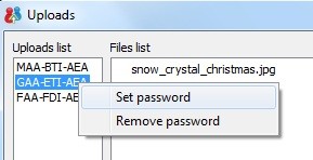 Danh sách những dữ liệu đã được bạn upload để chia sẻ sẽ được hiển thị ở bên trái. Để đặt mật khẩu bảo vệ cho quá trình chia sẻ, kích chuột phải vào 1 mục trong dánh sách, chọn Set password.