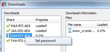 Để khai báo mật khẩu, bạn cần phải tìm đến hộp thoại Downloads (kích chuột phải lên biểu tượng phần mềm, chọn Downloads). Từ hộp thoại hiện ra, kích chuột phải vào mục download tương ứng yêu cầu mật khẩu, chọn Set Password. Điền mật khẩu tương ứng vào hộp thoại để quá trình download diễn ra.