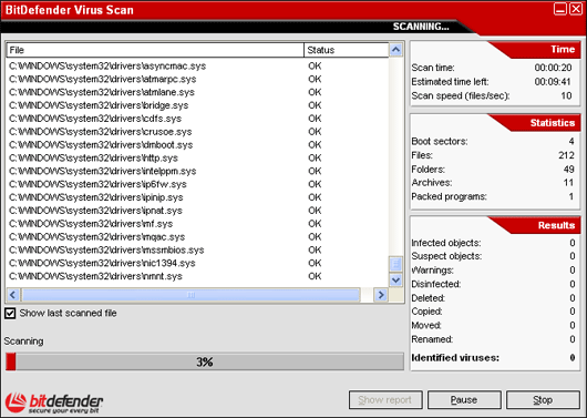 7. Chọn nút Finish để hoàn thành việc cài đặt và chương trình sẽ tự động mở ra cửa sổ Bitfender virus scan – Bắt đầu quét virus: