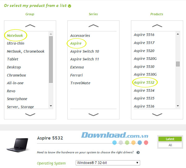 Hoạc nhập Product Model của máy: Acer Aspire 5532