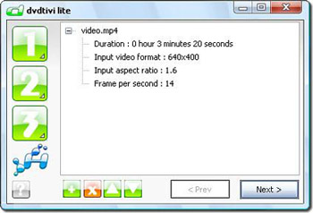 Giao diện chương trình giúp bạn chuyển đổi thành công chỉ với ba bước: Thêm tập tin, chọn chất lượng và ghi. Dvdtivi lite có thể tối ưu hóa chất lượng âm thanh, bitrate, chuẩn màn hình TV, định dạng màn hình TV và sample rate để tạo DVD chất lượng cao.