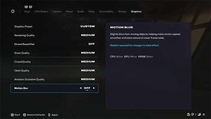 Các cài đặt này ưu tiên hiệu năng và sự mượt mà khi chơi hơn tất cả. Hầu hết tùy chọn hình ảnh đều đặt ở mức trung bình, đồng thời tắt Strand-Based Hair để giảm tải GPU. Người chơi vẫn sẽ có trải nghiệm hình ảnh sân cỏ đẹp mắt, nhưng không phải đánh đổi FPS, kể cả trong Career Mode hay Ultimate Team.
