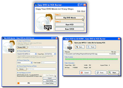 Easy DVD to VCD Burner là một tiện ích nhỏ cho phép thu lại đĩa DVD phim và lưu vào đĩa cứng hoặc ghi ra đĩa CD dưới các dạng VCD (1.1,2.0), SVCD hoặc DivX (MPEG4) thông dụng chỉ với vài cú nhấn chuột. Nó tạo ra sản phẩm video với chất lượng âm thanh và hình ảnh tuyệt vời đồng thời file tạo ra có dung lượng nhỏ hơn so với các ứng dụng tương tự.
