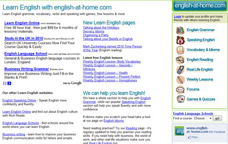 Tự học tiếng Anh tại nhà thông qua mạng Internet ngày càng phổ biến. Số lượng các trang web hướng dẫn và dạy học tiếng Anh trực tuyến ngày càng nhiều và chất lượng cũng ngày càng được nâng cao. English-at-home.com là một trong số đó.