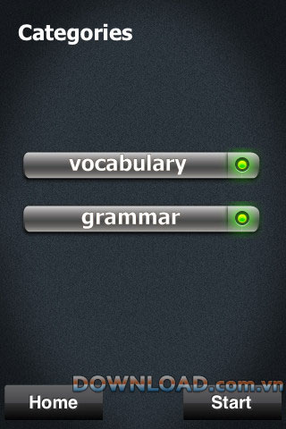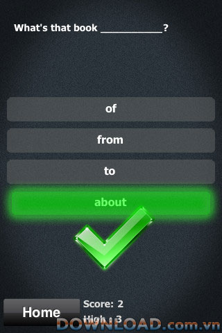 Ứng dụng bao gồm hàng ngản câu hỏi từ cơ sở dữ liệu câu hỏi (yêu cầu kết nối Internet); giữ điểm số sẽ giúp bạn ghi nhớ câu trả lời và học tiếng Anh nhanh hơn.
