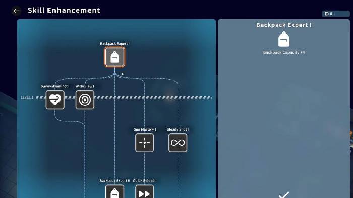 Sức chứa của ba lô quyết định người chơi có thể mang theo bao nhiêu vật phẩm trong mỗi nhiệm vụ. Để nâng cấp: