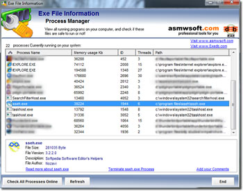 Với chương trình này, bạn có thể xem tất cả các chương trình đang chạy trên máy tính và kiểm tra các tập tin có an toàn để chạy hay không. Exe File Information giúp bạn tìm thêm thông tin về các chương trình đang chạy ở nền, vì vậy bạn có thể dễ dàng xác định chương trình nào là an toàn. Giao diện đơn giản của chương trình sẽ hiển thị danh sách các tiến trình đang chạy, đầy đủ với tên, bộ nhớ sử dụng, đường dẫn.