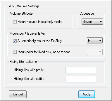 Chúng ta chọn vào phân vùng ext2/ext3 và nhắp đôi vào.Chọn vào Automatically mount via Ext2Mgr và chọn ổ địa sẽ được gắn cho phân vùng này( Ví dụ H: ). Và chọn Apply.