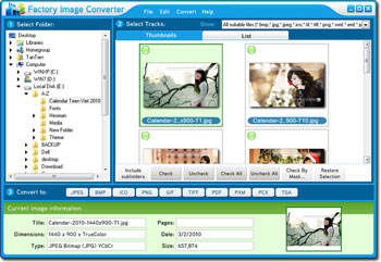 Bạn có thể thêm hình mờ vào hình ảnh với Factory Image Converter, đó có thể là ngày tháng, bình luận hoặc một số hình ảnh. Bạn chỉ cần chọn phông chữ và màu sắc của văn bản. Chương trình cung cấp 2 chế độ cho bạn: danh sách tập tin và danh sách hình thu nhỏ. Chế độ hình thu nhỏ sẽ rất tốt khi bạn không nhớ tên của tập tin mà bạn muốn chuyển đổi. Nếu bạn có đến vài trăm hình ảnh muốn chuyển đổi, bạn có thể sử dụng chế độ theo lô. Bạn chỉ cần kiểm tra các tập tin muốn chuyển đổi và thiết lập các thông số, chương trình sẽ chuyển đổi tất cả.