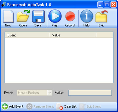 Thanh toolbar chính gồm các nút: New (Tạo bảng tiến trình mới), Open (Mở lại bảng tiến trình đã tạo), Save (Lưu lại bảng tiến trình), Play (Thực hiện các tiến trình), Record (Ghi lại các hoạt động của chuột), Help (Trợ giúp), Exit (Thoát khỏi chương trình).
