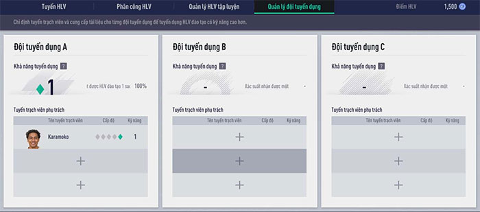 Người chơi muốn tuyển huấn luyện viên có 3 kỹ năng thì cần phải nâng cấp kỹ năng của người có nhiều sao nhất. Sau đó, tiến hành chuyển HLV đó lên Quản lý đội tuyển dụng để sở hữu bộ kỹ năng chất lượng nhất. Ngoài ra, game thủ nên tích lũy CP thay vì đổi HLV mới 50 CP.