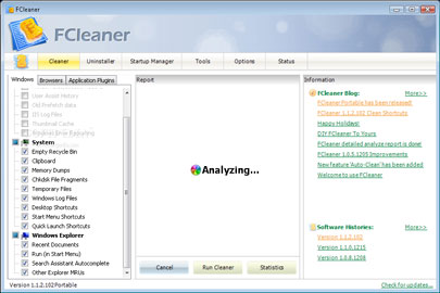 FCleaner là một phần mềm miễn phí tất cả trong một giúp tối ưu hoá và làm sạch hệ thống Windows. Chương trình loại bỏ các tập tin không sử dụng và các mục regsirty không hợp lệ đã ngốn không gian đĩa và làm chậm hệ thống của bạn, tinh chỉnh hệ thống giúp Windows chạy nhanh hơn.