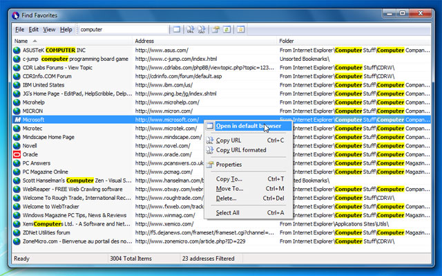 Find Favorites là một chương trình miễn phí cho phép bạn tìm kiếm trong phần Favorites của Internet Explorer, tìm kiếm cả phần mô tả và địa chỉ website. Sau đó sẽ tập hợp tất cả thành một danh sách, bạn có thể click kép lên một trong các link để mở chúng trong trình duyệt mặc định của mình (VD như Mozilla Firefox, Safari,...).