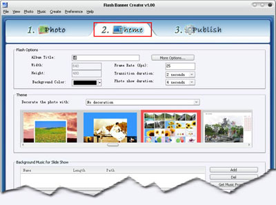 Bạn có thể sử dụng ảnh và nhạc của riêng mình kết hợp chúng với các hiệu ứng chuyển cảnh động để tạo các biển quảng cáo và banner flash chuyên nghiệp hơn. Flash Banner Creator tích hợp hơn 50 mẫu Flash thú vị giúp bạn tạo một biểu ngữ Flash hấp dẫn và bắt mắt.