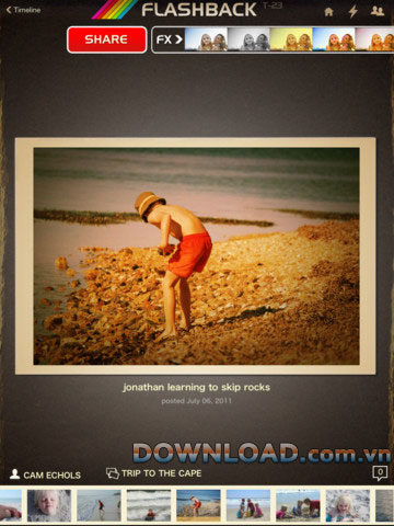 Tương tự như Timeline của Facebook, người dùng có thể cuộn ngược thời gian cùng lúc để xem những ảnh bạn đã bỏ qua hoặc để Flashback chọn ảnh ngẫu nhiên trong lịch sử.