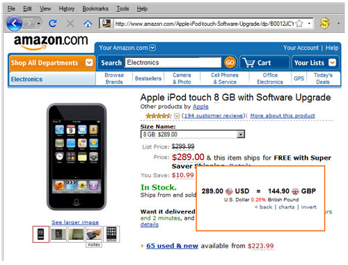 Như vậy, nếu bạn đang duyệt trang của một quốc gia ở châu Âu và tính chuyện đặt hàng, chỉ việc nhấp chuột vào giá (biểu thị bằng đồng Euro), bạn sẽ biết ngay qui đổi ra USD chính xác là bao nhiêu.