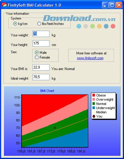 Chỉ cần nhập vào trọng lượng hiện tại trong mục Your weight và chiều cao trong mục Your height, xác định giới tính của bạn là nam (Male) hay nữ (Female) trong mục Sex, chương trình sẽ cho bạn biết chỉ số thể trọng hiện tại của bạn trong mục Your BMI is và trọng lượng lý tưởng mà bạn cần phấn đấu trong mục Ideal weight. Ngoài ra, bạn hãy chú ý nốt tròn màu nâu trong BMI Chart. Đó chính là chỉ số BMI của bạn trong tương quan với tình trạng béo phì (Obese), dư cân (Overweight), bình thường (Normal), gầy (Underweight) và cân đối (Median).