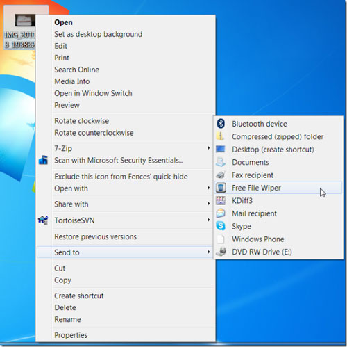 Ngoài ra, Free File Wiper còn cho phép bạn xóa file thông qua menu ngữ cảnh (menu chuột phải khi click lên bất kỳ file hay thư mục nào). Bạn nhấp chuột phải lên file muốn xóa và chọn Send To -> Free File Wiper.