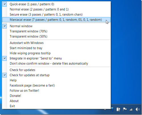Theo mặc định, Free File Wiper xóa file hoàn toàn bằng cách ghi đè dữ liệu lên vùng chứa file gốc một lần. Để tăng tính bảo mật, bạn có thể tùy chọn ghi đè dữ liệu hai lần, ba lần hoặc tối đa bảy lần. Các tùy chọn này có thể được tìm thấy bằng cách click phải chuột vào biểu tượng chương trình ở khay hệ thống. Ngoài ra, bạn còn có thể tùy chỉnh Free File Wiper khởi động cùng với Windows, chỉnh độ trong suốt của chương trình và nhiều chức năng khác....