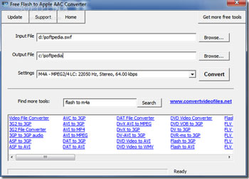 Free Flash to Apple AAC Converter là một chương trình dễ dàng sử dụng mà cho phép bạn chuyển đổi các file Flash sang định dạng AAC của Apple một cách dễ dàng. Chương trình có một giao diện dễ dàng sử dụng mà sẽ giúp bạn hoàn hành quá trình chuyển đổi chỉ với một vài click. Để chuyển đổi bạn chỉ cần chọn file cần chuyển đổi, chọn thư mục để lưu file đầu ra và các thiết đặt đầu ra, sau đó click vào nút bấm "Convert". Bạn sẽ có những file định dạng AAC