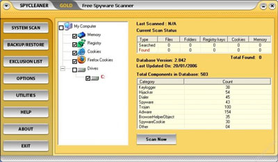 Free Spyware Scanner có khả năng quét trong bộ nhớ, trong Registry, trong các Cookies do trình duyệt để lại và trong ổ cứng.