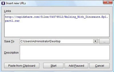 Để tiến hành download 1 file từ dịch vụ chia sẻ, ví dụ ở đây, ta download file từ dịch vụ RapidShare, bạn chỉ việc copy đường link download của file đó, click vào Add Url trên giao diện chương trình và dán đường link đó vào khung hiện ra. Thông thường, khi bạn copy đường link đó, khung Add Url của chương trình sẽ hiện ra và dán đường link đó vào danh sách download một cách hoàn toàn tự động. Click vào nút “…” ở mục Save To để chọn vị trí lưu file download. Cuối cùng, nhấn Start để bắt đầu quá trình download.