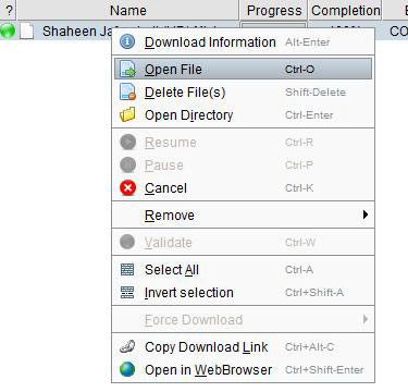 Sau khi quá trình download 1 file kết thúc, bạn click chuột phải vào file đó trong danh sách download của chương trình, chọn Open File để mở file hoặc Open Directory để mở thư mục chứa file đó.