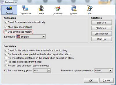 Trong trường hợp bạn không muốn chương trình lưu lại lịch sử các file đã download, tại giao diện của chương trình, bạn chọn Options -> Preferences. Cửa sổ Preferences hiện ra, tại tab General, bạn bỏ đi tùy chọn Use downloads history và nhấn Ok để thiết lập có giá trị.