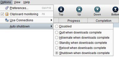 Ngoài ra, 1 tính năng không thể thiếu đối với 1 chương trình “tự động hóa download”, đó là tính năng tự động tắt máy sau khi quá trình download kết thúc. Để sử dụng tính năng này, từ menu của chương trình, bạn chọn Options -> Auto Shutdown. Tại đây bao gồm các tùy chọn cho phép bạn đơn giản là thoát chương trình (Quit), đặt máy tính vào chế độ Hibernate, Standby hoặc khởi động lại và tắt máy tính sau khi quá trình download các file trong danh sách kết thúc. Chọn Shutdown when Downloads complete để tắt máy sau khi quá trình download hoàn tất. Đây có thể coi là tính năng hữu ích, giúp bạn có thể để máy download file và tự động tắt máy sau khi kết thúc mà không cần phải ngồi thường trực bên máy tính.