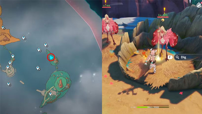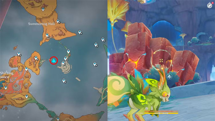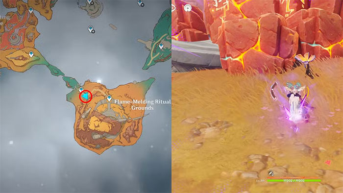 Khối Pulverite thứ hai có thể được tìm thấy phía dưới điểm dịch chuyển của Xưởng Vũ Khí Hư Hại. Lần này, hãy nhập vào một Tatankasaurus và phá vỡ khối Pulverite để lấy rương kho báu trong Genshin Impact.
