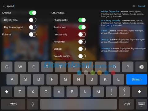 Giao diện của Getty Images cho iOS được thiết kế tối giản với tông màu đen chủ đạo cùng phần thực đơn ngắn gọn, dễ điều hướng. Tất cả những gì bạn cần làm chỉ là cài đặt bộ lọc theo mục đích tìm kiếm, sau đó có thể duyệt ảnh tức thời theo từ khóa bất kỳ đã nhập.