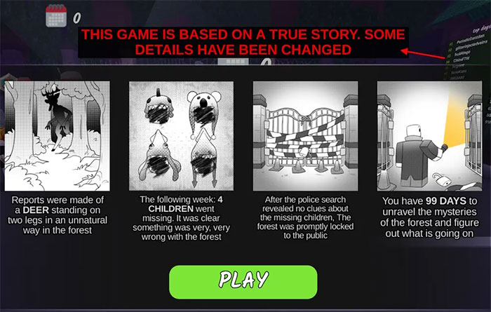 Một trong những hình ảnh quảng bá đầu tiên của 99 Nights in the Forest trên Roblox từng tuyên bố đầy táo bạo rằng trò chơi được lấy cảm hứng từ một câu chuyện có thật. Tuy nhiên, không có bất kỳ lời giải thích chính thức nào từ phía nhà phát triển. Dù vậy, mỗi khi bạn vào game, sẽ có thông báo hiện ở đầu màn hình với dòng chữ: “Trò chơi dựa trên một câu chuyện có thật. Một số chi tiết đã được thay đổi”.