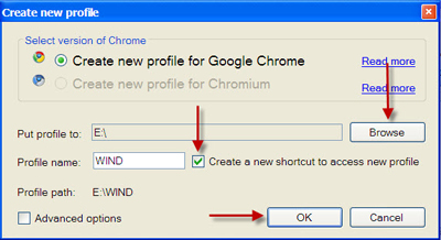 Bạn có thể tạo shortcut bằng cách chọn 'Create a new shortcut to access new profile' từ màn hình desktop.