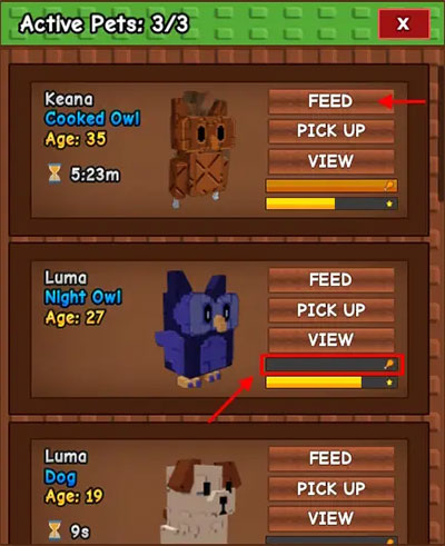 Người chơi có thể kiểm tra độ đói của thú bằng cách mở Pet HUD từ menu bên phải hoặc nhấn vào từng thú cưng. Để cho ăn, hãy cầm một loại trái cây lớn như Burning Bud hoặc Sugar Apple, sau đó nhấn nút Feed hoặc nhấn phím F khi đứng gần thú. Mọi người vẫn có thể dùng trái nhỏ, nhưng trái lớn sẽ làm đầy thanh đói nhanh hơn. Hãy duy trì việc cho ăn thường xuyên để tối đa hóa lượng XP nhận được.