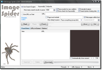 Với sự giúp đỡ của GSA Image Spider bạn có thể tải về tất cả hình ảnh từ một máy chủ web một cách tự động. Bạn cũng có thể nhập một từ khóa để tìm các hình ảnh có liên quan từ các trang web trên toàn thế giới. Nó rất dễ dàng sử dụng và mang đến cho bạn những kết quả bất ngờ chỉ trong vòng vài giây. GSA Image Spider tìm kiếm tất cả các liên kết trang web yêu thích của bạn, phân tách, trích xuất và thu thập tất cả những tranh và hình ảnh bạn có thể tải về bằng tay.