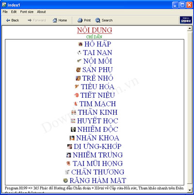 Phần mềm H199 tích hợp thông tin về 365 bệnh trạng thường gặp, thu thập từ sách báo và internet, có hướng dẫn thiết thực để thi hành trên lâm sàng. Sử dụng được trên điện thoại di động, máy tính cục bộ, truy cập qua internet và mạng không dây.