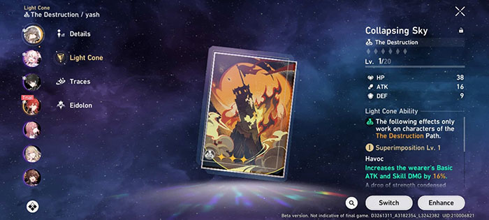 Light Cones có các tiêu chí về tính đủ điều kiện của con đường phát triển nhân vật, chúng hoạt động tốt nhất khi nhân vật của một con đường tương tự trang bị thẻ trong trò chơi. Đối với các con đường của nhân vật khác nhau, cũng có các loại Light Cones khác nhau để game thủ trang bị cho nhân vật.