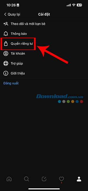 Bước 3: Tại danh sách các Cài đặt, nhấn vào Quyền riêng tư.