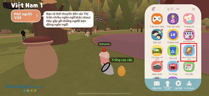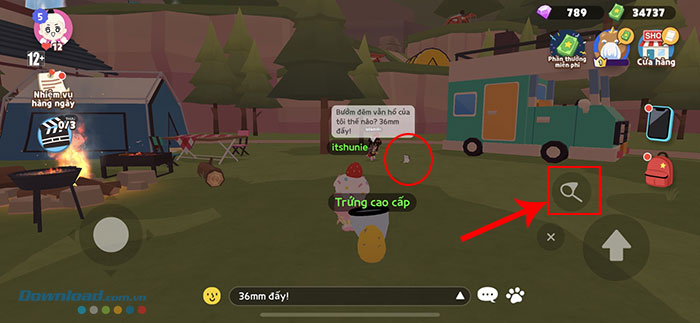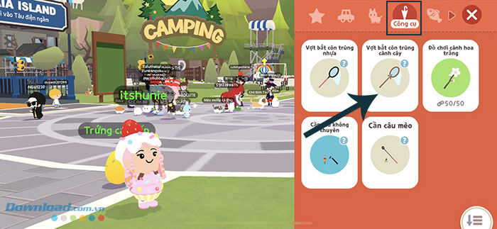 Bước 6: Nhấn vào biểu tượng balo và chọn trang bị vợt vừa mua trong tab Công cụ. Nhân vật sẽ cầm vợt và nhiệm vụ của người chơi là đi xung quanh khu cắm trại để tìm kiếm côn trùng.