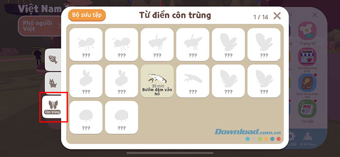 Tiếp tục chọn tab Côn trùng có biểu tượng con bướm. Hiện tại, đang có 14 loại côn trùng trong Play Together.