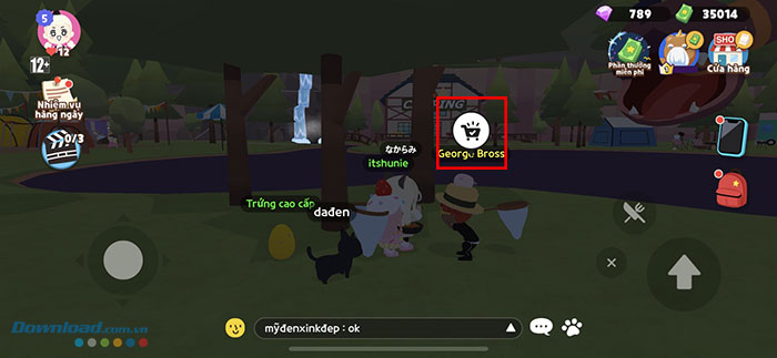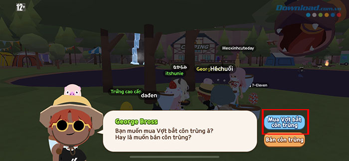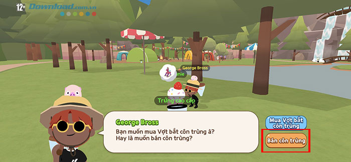 Bước 3: Trò chơi sẽ điều hướng mọi người tới khu cắm trại để gặp NPC George Bross - người phụ trách nhiệm vụ săn côn trùng. Lúc này, hãy nhấn vào biểu tượng giỏ hàng trên đầu của NPC.