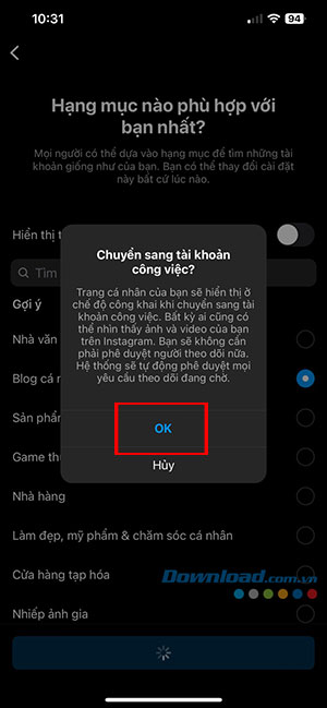 Bước 3: Xác nhận chuyển sang tài khoản công việc bằng cách chạm vào OK.
